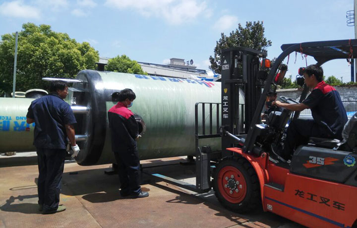 上海一体化泵站厂家弘泱科技的小伙伴们,在吊装前已经准备就绪,他们或开叉车、或指导搬运、或准备筒体下面防治的沙袋等。