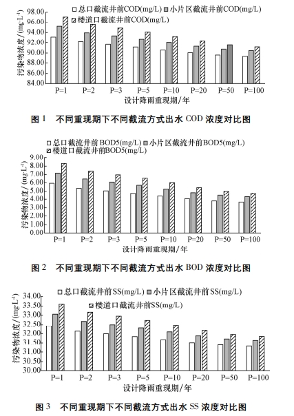理论数据分析: 经理论计算得出不同重现期下主要污染物浓度分析详见:图1为不同重现期下不同截流方式出水 COD 浓度对比,图2为不同重现期下不同截流方式出水 BOD 浓度对比,图3为不同重现期下不同截流方式出水 SS 浓度对比实测数据分析:工程实施后根据现场实测数据分析。实测结果显示:在城中村合流制污染物浓度由于受降雨影响,均比理论值有所降低;②当每栋楼设置截流井时,其溢流污染物浓度中,COD与《城镇污水处理厂污染物排放标准》(GB 18918-2002)中一级 B相当口;③总口截污时其溢流污染物浓度与二级标准相当;4巷道口截污污染物浓度相比总口截污约降低 1.5%;⑤从计算结果分析来看,重现期对污染物浓度的影响并不明显。