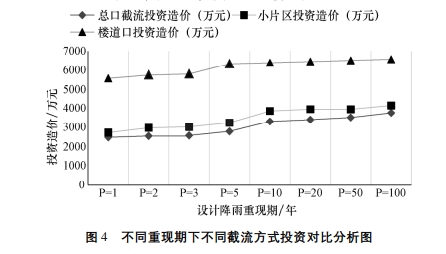 很明显,楼道口截流,基本就是与分流制类似了,此时从巷道到设计边界,均需两套排水系统,同时还需要对建筑合流立管进行改造,故造价自然是最高的,但是对于小片区截流:从楼道至巷道口均为一趟排水系统,只是在截流并的地方需要增加一趟溢流的雨水系统,与总口截流相比,造价略高 10%~15%,但是楼道口截流却比总口截流基本翻了1倍,结合水质情况,小片区截流水质介于楼道口截流与总口截流之间,不同重现期下不同截流方式投资对比分析如图4所示: