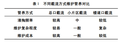 从维护管养对比结果分析可以看出,小片区截流不管是清掏频率还是维护成本及维护复杂程度都是比较适中的,既避免了总口截流方式旱季流速小易导致淤积的情况,又降低了楼道口截流设置过多小方井增加维护复杂程度,从而降低了维护成本。故综合来看,小片区截流是比较适合的截流方式。