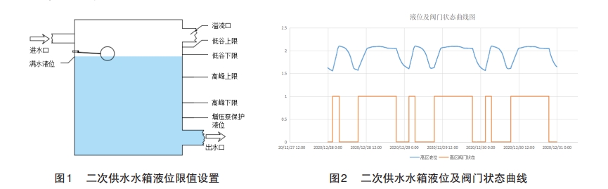 精准化控制的原理就是,将水箱进水阀门改造为可远程控制阀门,在用水高峰期关闭进水阀门,使用水箱中储存的水给高层用户供水,避免用水高峰期水箱进水阀门打开给管网压力带来的损失,从而改善直供用户用水质量,在用水低谷期打开供水阀门给二次供水水箱补水,通过这种方式来合理利用水厂产能,实现用水平衡、稳定管网压力、节能降耗。
