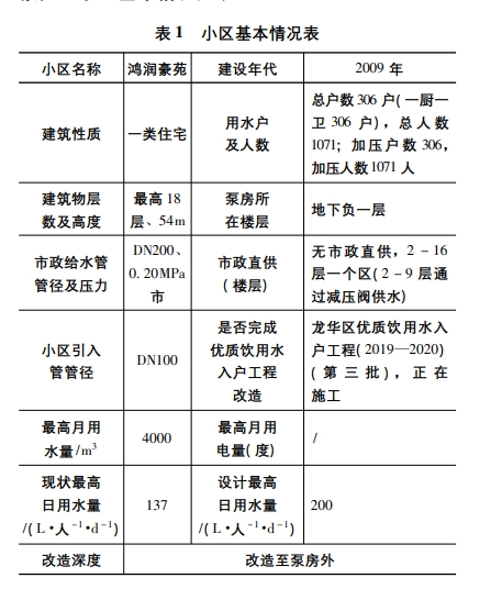 3.1 小区泵房情况评估本次给水改造各个小区分散各自独立,各小区设计范围较小,采用居民生活用水定额预测方法进行计算网,本设计案例小区为龙岗区樟富南路鸿润豪苑,小区基本情况见表1。