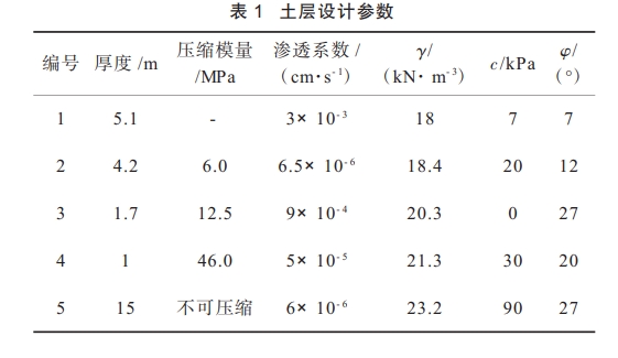场地的工程地质条件和基坑围护设计参数见表1(分为五个土层:1 素填土,2粉质黏土,3 粉砂,4 强风化泥质粉砂岩,5 中风化泥质粉砂岩)。