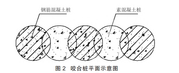 咬合桩具有防渗能力强、造价低、无需泥浆护壁、施工速度快、成桩质量高等优点,且适用于多种地质条件。钢筋混凝土桩与素混凝土桩切割咬合桩与桩之间排列构成相互之间互相咬合的桩墙,此种结构即为咬合桩。为便于切割,桩的排列方式一般为一根素混凝土桩和一根钢筋混凝土桩。素混凝土桩采用超缓凝混凝土(初凝时间为60h),要求必须在素混凝土桩初凝之前完成对素混凝土桩的全部切削。钢筋混凝土桩施工时采用全套管钻机切割相邻素混凝土桩相交部分的混凝土,实现咬合。咬合桩施工采用全套管+旋挖钻机,施工流程为平整场地→测设桩位→施工咬合桩导墙→套管钻机就位对中一吊安第一节套管→控测垂直度→压人第一节套管→校核垂直度→抓斗取土,套管钻进→孔深测量→清除虚土,检查孔底→钢筋混凝土桩吊放钢筋笼→放人混凝土灌注导管→灌注混凝土逐次拔管→测定桩顶混凝土面→套管钻机移位。咬合桩构造如图2所示。