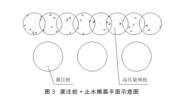灌注桩支护体系适用于各种地质条件下的深基坑工程,具有刚度大、变形小、技术成熟、施工速度快等优点。当需要隔地下水时,需要另行设置隔水帷幕。考虑到场地内的孔隙潜水,在灌注桩外侧设高压旋喷桩止水帷幕。灌注桩+止水帷幕构造如图3 所示。