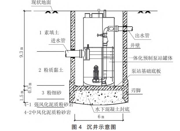 泵站地面绝对高程为 60.6 m(国家 85 高程)。在场地内钻探所达深度范围内地基土层主要由素填土、粉质黏土、粉砂、强风化泥质粉砂岩和中风化泥质粉砂岩组成,场地类别为Ⅱ类。第①层素填土为第四系人工堆积层,层厚5.1m,低承载力,大孔隙,不均匀。第③层粉砂为一体化预制泵站基础底板持力层,粉砂层渗透系数较大,当基坑开挖至底部时,在基坑内外水头差的作用下,土体易产生管涌流砂等现象。
