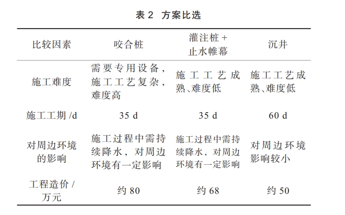 本工程基坑深度为 10 m,基坑周边有西气东输管线、燃气管线、市政管线及现状市政道路等设施根据《湖北省地方标准基坑工程技术规程》(DB42/T159-2012)2,基坑重要性等级为二级。由于基坑周边环境的限制,基坑不具备放坡开挖的条件。为控制基坑变形,确保周边环境安全,基坑应采用刚度较大的围护结构。在安全、合理、经济、可行的基本原则下,针对本工程基坑的开挖深度、开挖面积、场地内土质情况及周边环境等因素,为保证工程在工期紧张的情况下按时完成,在设计初期共提出咬合桩、灌注桩+止水帷幕和沉井3种支护方案,并从技术难度、施工工期和工程造价等方面进行了对比分析,综合对比后选择最优方案。