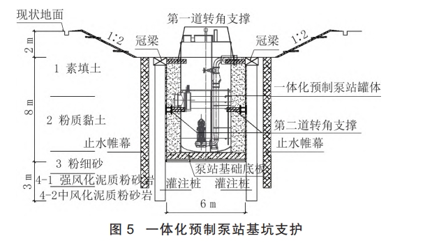 一体化预制泵站基坑深度一般较深,但基坑平面尺寸较小,基坑规模小,深基坑支护方案应根据工程实际情况进行方案比选,选型合理、技术可行、经济适用且兼顾工期的要求,选择最适合的方案。