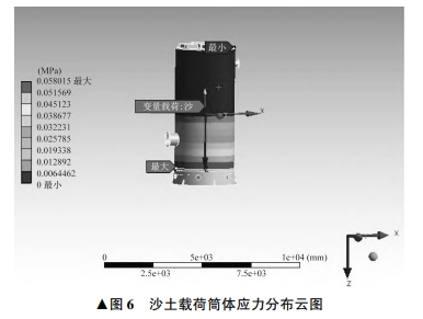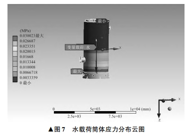 式中:ρ1 为沙土密度,取 1 900 kg / m 3 。 沙土对筒体壁面和底座底面施加载荷,筒体荷载 后的应力分布云图如图 6 所示。 由图 6 可见,筒体外 壁面受力自上而下逐渐增大,筒体外壁面接近底座处 受到的应力最大,为 0. 058 015 MPa。 筒体内部有水时,筒体内部受到的压力P2与水的深度 h2 有关,为: P2 = ρ2 gh2 (2) 式中:ρ2 为水的密度,取 1 000 kg / m 3 。 筒体加水至启泵液位,高度为 3 400 mm,水对筒 体壁面和底面施加载荷,筒体壁面荷载后的应力分布 云图如图 7 所示。 由图 7 可见,筒体壁面受力自上而 下逐步增大,筒体壁面接近底座处受到的应力最大,为 0. 030 023 MPa7