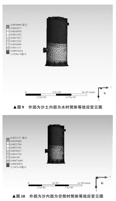第二强度理论认为材料破坏的主因是最大伸长应变,当达到拉伸极限时材料会出现断裂。简体外部为沙,内部为水时的等效应变云图如图9所示,最大等效应变出现在进口管道和底座附近区域,最大等效应变值为0.0050089.与筒体相比变化极小,不会出现断裂的危险。