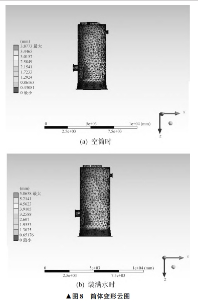 刚度指材料或结构在受力时抵抗弹性变形的能力,是材料或结构弹性变形难易程度的表征。材料的刚度通常用弹性模量来衡量。在宏观弹性范围内,刚度是零件荷载与位移成正比的比例系数,即引起单位位移所需的力。刚度的倒数称为柔度,即单位力引起的位移。刚度可分为静刚度和动刚度。通常采用材料在一定受力下的变形量大小来校核材料的刚度是否满足要求。简体在不同条件下的变形云图如图8所示当筒体内部为空筒时,简体最大变形量为3.8733mm。当筒体内部为水时,简体最大变形量为5.8658mm。