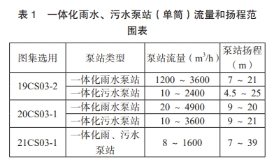 根据《19CS03-2一体化预制泵站选用与安装(二)》《20CS03-1 一体化预制泵站选用与安装(一)》《21CS03-3 一体化预制泵站选用与安装(三)》“-8 三本图集,目前可供选择的一体化雨水、污水泵站(单简)流量和扬程范围如下表1。