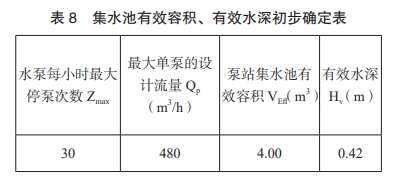 《室外排水设计规范》(GB50014)中规定自动控制水泵每小时不超过6次,而对于一体化泵站中水泵因配备高启停次数电机,目前一般最大允许启停次数为10~30次,所引用图集也依据此条说明。集水池有效容积及有效水深初步确定如下表 8.