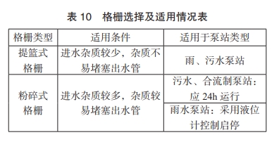 因一体化泵站中所用格栅尺寸相对较小,可依据图集直接选定型号规格,若需特殊设计时,可按《给排水设计手册-第5册城镇排水》5.1节计算。格栅选择及适用条件如下表 10。
