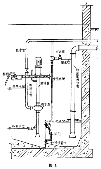 在后一种情况下,当开动立式液下泵时,同时开启灌水管上的电磁阀。于是该泵的出水分为两路:一路直接排入泵房的出水井。另一路经地面泵的吸水管、泵体和压水管排人泵房的出水井,执行灌水排气程序。当灌水时,底阀内的拍门必有泄漏,然而该泄漏量只会占液下泵出水量的很小一部分。因此灌水仍能在很短时间内完成。当灌水完成后即可启动地面泵,同时关闭灌水管上的电磁阀。此后,底阀内的拍门就呈开启状态,地面泵与液下泵共同运行。
