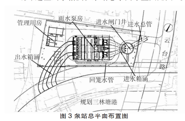 在泵站内设置独立管理用房,其内配置会议室、办公室、休息室、茶水间、卫生间及浴室等设施。为保证雨水泵站出水条件良好,管理用房采用“L”形,避让出水箱涵。泵站总平面布置图见图3.