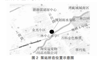 雨水泵站规划用地为东西向狭长地块,规划红线西北侧紧贴现状金光小区围墙,东侧为规划云台路、湾流域城三期,南侧为现状三林塘港。规划雨水泵站场地现状房屋均已拆迁,主要为建筑垃圾堆积,但规划红线南侧有2栋民宅,近期不拆迁。泵站所在位置示意图见图2