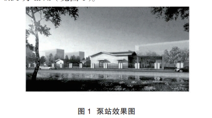 雨水泵站由进水闸门井、主泵房、出水高位闸门井、变配电间及管理用房等组成。泵站内设置4m宽环形通道,道路转弯半径乡6m。泵站内道路与站外市政道路接顺,泵站站内地坪标高以泵站周边道路设计标高为参照,高于周边道路0.20 m,站内室内地坪比室外地坪高0.30m。泵站内空地绿化不应小于30%,形成优美环境。泵站围墙采用铸铁栅透绿围墙。