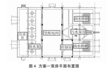 方案一。雨水泵房为雨水直进直出的矩形泵房,在雨水泵房中间设置污水截流泵房",正向出水。主泵房上部不设置设备房间,起重设备采用单梁门式起重机,仅在主泵房集水池上部设置变配电间及控制室(见图4)。