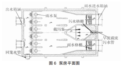 污水截流泵房设置在雨水泵房中间,在雨水格栅井、污水截流设施格栅井处设置封闭式臭气收集罩。格栅间散发的臭气收集后,经处理达标后排放。泵房平面图见图6