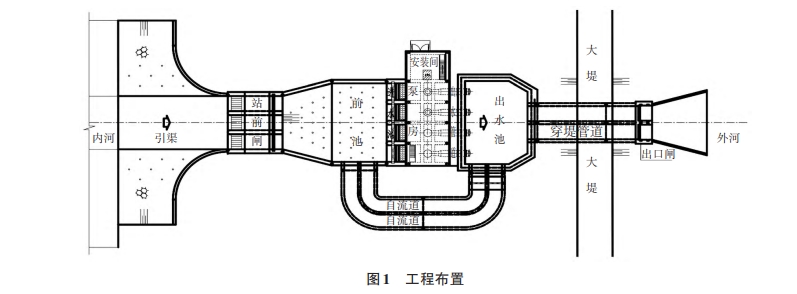 以排水泵站为例,泵站工程按顺水流方向一般布置有引渠、站前闸(含清污设施)、前池、进水池、泵房、出水管道、出水池、穿堤管道、出口闸等,如图1所示。