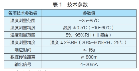 此类传感器为传感、变送一体化的设计,能够根据被测场地调整传感器配置数量。通过 4-20mA 接口与主机相连并采用模拟量来对湿度、温度进行表达。控制中心、泵站也能够通过系统实时检查仪器室的环境变化,并对空调、新风系统等进行远程控制。主要技术参数可参考表1。