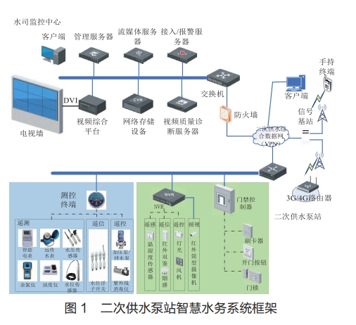 智慧水务是智慧城市中非常重要的组成部分,作为城市供水管网重要节点的高坪偏远地区供水加压泵站智慧化运行更是实现智慧城市的基础保证。通过对二次供水相关主管部门调研,并结合各地水司二次供水泵站接收管理规范,日常管理中的主要需求包括:在二次供水有限公司建设监控中心以监视泵站情况实现集中维护、每个泵站安装视频监控设备监控供水设备允许状态、远程监视泵站视频图像、监视异常情况(门禁开启、人员入侵、火灾报警、泵站温湿度)、远程控制(灯光排风、门禁等)开关、监视水池水位流量等信息、泵站供电电流电压等信息、远程控制供水系组的启停等。