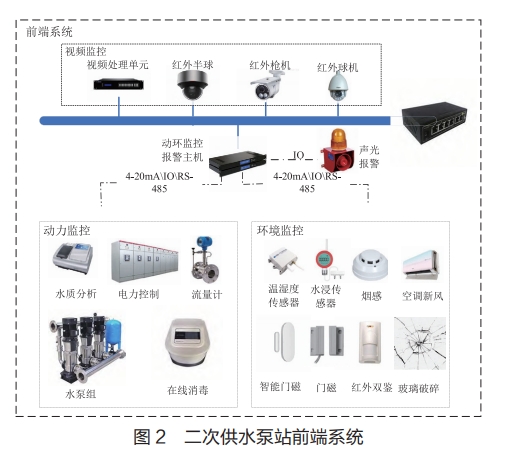在二次供水泵站的前端系统中有视频处理单元、红外设备等监控子系统,水质分析、流量计等动力监控子系统,各类传感器、空调等环境监控子系统,门碰等门禁控制子系统,这些子系统构建为完整的前端系统,其架构如图2所示。