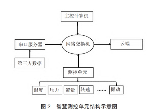 智慧测控单元由测量模拟量的模块、振动模块和主控计算机组成。模拟量主要包括:流量和压力信号,通常由电磁流量计和压力变送器转换成4~20 mA 信号,或通过现场总线传输数据;温度信号,通常由温度传感器(如 PT100)接入温度模块通过现场总线传输数据:电量,主要包括有功功率功率因素、电流和电压等。