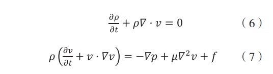 泵站的故障或潜在故障主要分为电气故障和机械故障。对于电气故障目前已有相对较可靠的方式,通过互感器感应各类信息,并通过相关智能化模块判断和处置故障。水泵机组的机械故障包括结构本身和组合(如泵体、叶片或转轴裂纹、轴承损坏、紧固件松动和安装等)引起的故障,还有由于水泵运行工况的变化引起的内部非稳态流动诱发的工况恶化和稳定性问题。理论上完全可通过分析流体和结构相互作用的力学模型加以解决。流体控制方程由连续性方程和纳维-斯托克斯方程(N-S方程)描述,见式(6)~式(7)。