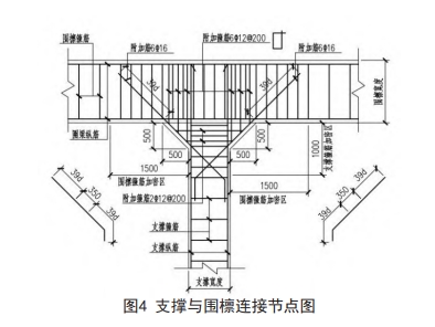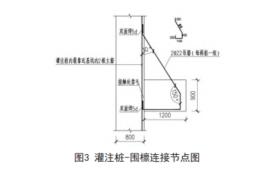 根据设计图纸提供的坐标计算出围檩交点处坐标,采用挖机开挖沟槽,待围檩处的土体开挖结束后,浇筑垫层,垫层采用100mm厚C20素砼,宽度以大于围或支撑宽度200mm为准。围檩及支撑的钢筋严格按照设计图纸要求的规格型号、间距等进行加工及安装,纵向主筋采用机械连接。第二道砼围檩施工时,灌注桩内侧钢筋进行剥皮,出主筋,钢筋砼围檩通过吊筋与注桩主筋相连,吊筋采用222(每两桩一组)进行配置。
